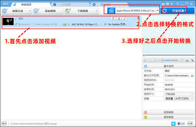 首先我们在电脑上点击下载该软件,下载好之后,点击打开。我们可以看到页面十分地清晰,有着每一步的指引。我们按照引导的步骤进行操作即可。点击添加mpeg4视频文件,选择目标转换格式,选择好之后,点击【开始转换】即可,转换后的视频可以进行下载。