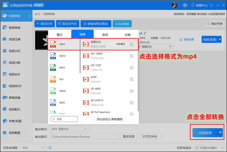 第二步 上传好视频文件之后,接下来点击选择转换的格式为mp4格式,然后点击【全部转换】即可。