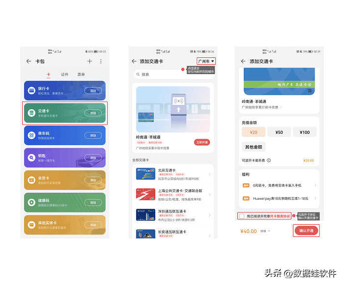 除了添加门禁卡,华为手机上的NFC功能还能怎么使用?它还能添加交通卡。打开“钱包”里面的“卡包”,在里面你会看到“交通卡”,点击添加,在打开的页面你会看到各个地方的交通卡。点击右上角的定位,手机系统会自动帮你定位当前所在的城市。