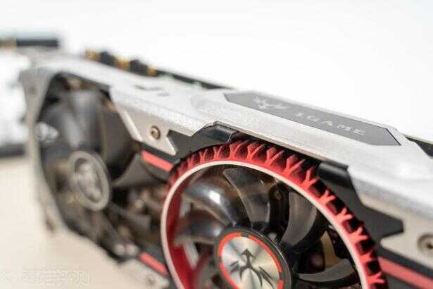▼不过这张卡的风扇罩用料确实是不错,别人家都是塑料风扇罩上点缀一些金属,七彩虹这张1080Ti直接就是金属材质上点缀一些塑料。你能看到的银色的、黑色的、红色的部分,全部都是铝合金材质,并且银色部分表面有细腻的喷砂处理,黑色部分表面是拉丝处理,整体风扇罩给人的触感和观感都非常棒。说实话,除了这个风扇不是太给力之外,七彩虹这张1080Ti的正面没啥好说的