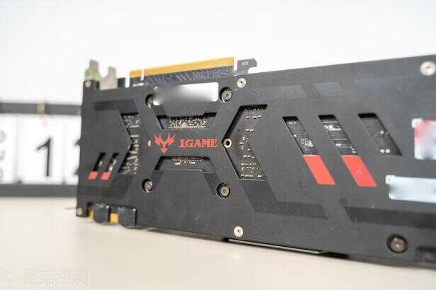 ▼显卡的背板整体是黑色的,上面点缀一些红色的元素,中间IGAME的LOGO,然后在核心和供电部分,背板上相应有一些开孔。和这张卡漂亮的正面相比,我感觉这张卡的背板就平淡无奇,造型也不漂亮,表面就是简单的喷砂,也没有漂亮的涂装,就感觉和显卡正面很不搭