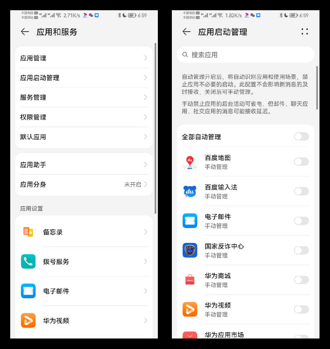 使用华为手机的用户,可以打开手机中的“设置”,然后找到“应用和服务”,再找到其中的“应用启动管理”,先将软件全部点击“关闭自动管理”,这样软件再关闭后就不会后台运行了。如果怕影响正常社交,可以单独打开常用社交软件的“自动管理”。