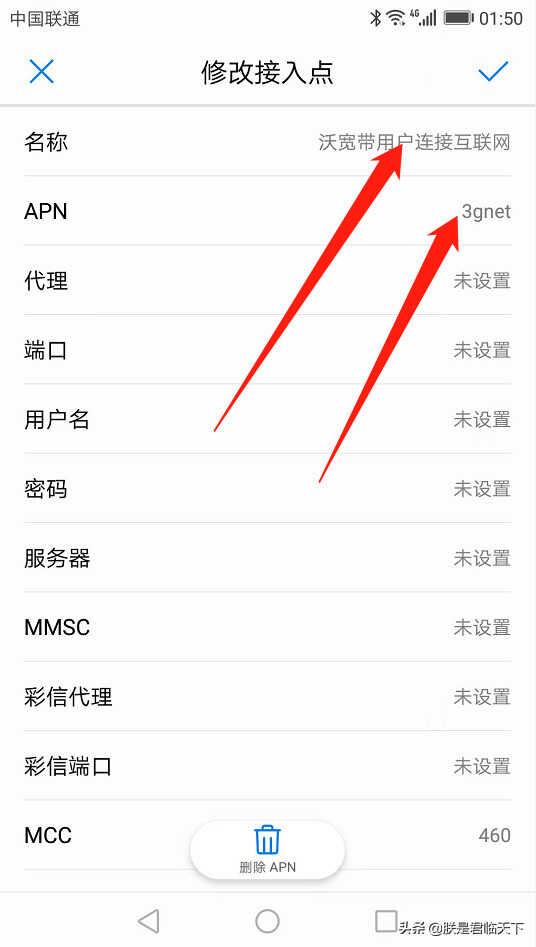 联通卡如何进入这里就不再赘述,直接看文字分进入:以小君华为手机为例,打开设置=》移动网络=》移动数据=》接入点名称(APN)=>APN=>沃宽带用户连接互联网=>,参考图片直接看怎么修改方法即可——
