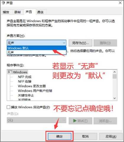 3.在“声音”设置这里查看是否显示为无声,若是显示“无声”的话,我们重新更改为“默认”即可,声音就回来了!
