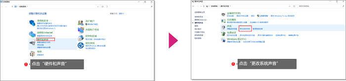 1. 启动【控制面板】后点击“硬件与声音”,然后选择“更改系统声音”,若显示为“无声”,则将“无声”重新修改成“默认”选项。