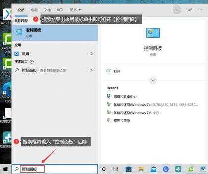 1.我们电脑任务栏的左侧,也就是紧挨【开始】图标的右侧是一个搜索框(部分电脑需要点击【开始】后才会看到),我们在搜索框内输入“控制面板”四字,搜索结果出来后单击一下鼠标即可打开。