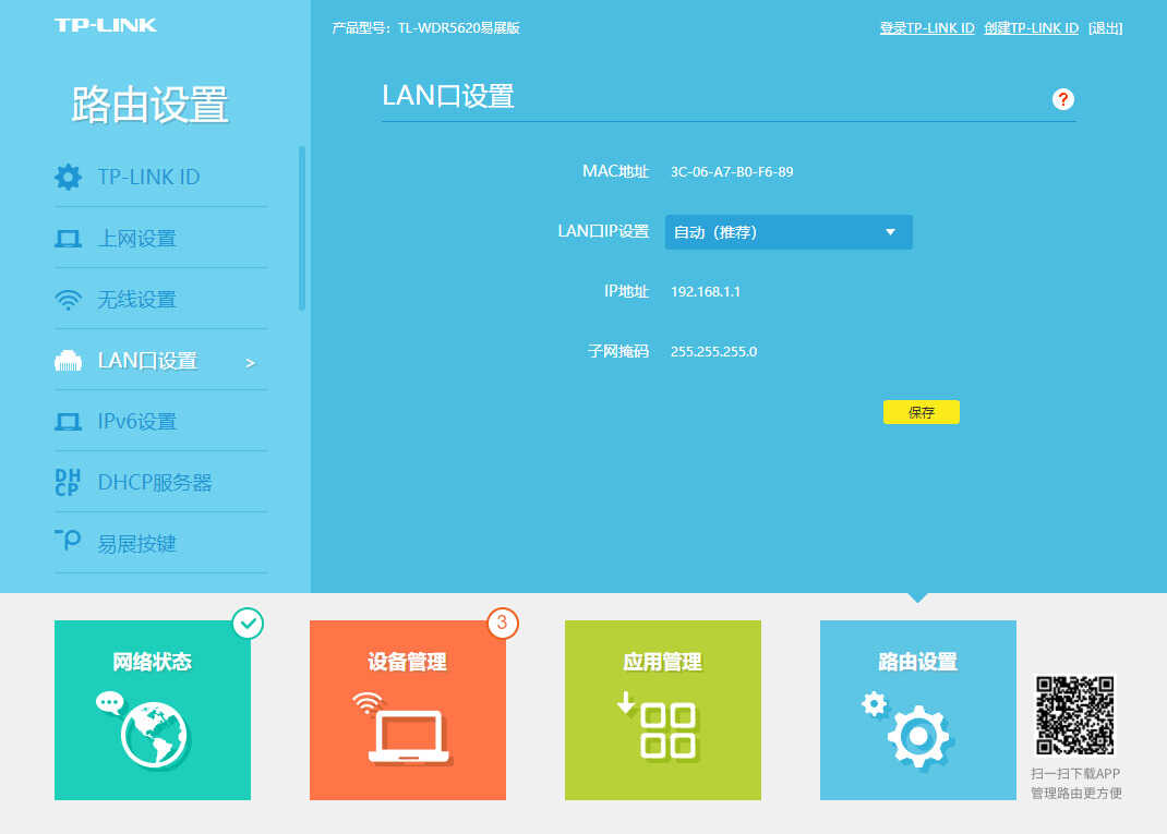 LAN口IP设置一般设置为自动,系统会自动为你分配 IP地址。点击保存,路由器一般会自动重新启动,如果不重启,可以点击重启路由器(如下图),启动后退出设置,至此设置全部完成,可以上网了。