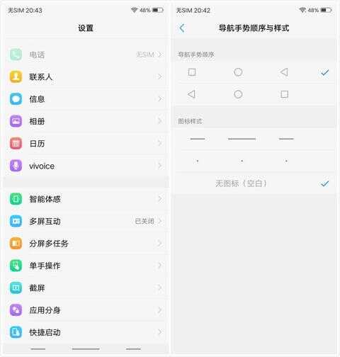在全面屏的交互手势上,这次vivo则增添两种全新的手势样式。因为在之前的vivo X20上,只有隐藏导航栏这一选项,并没有给用户别的选择。而这一次,vivo在图标样式上,增加了“横条”以及“点”两种选项,让用户有了更多的选择。