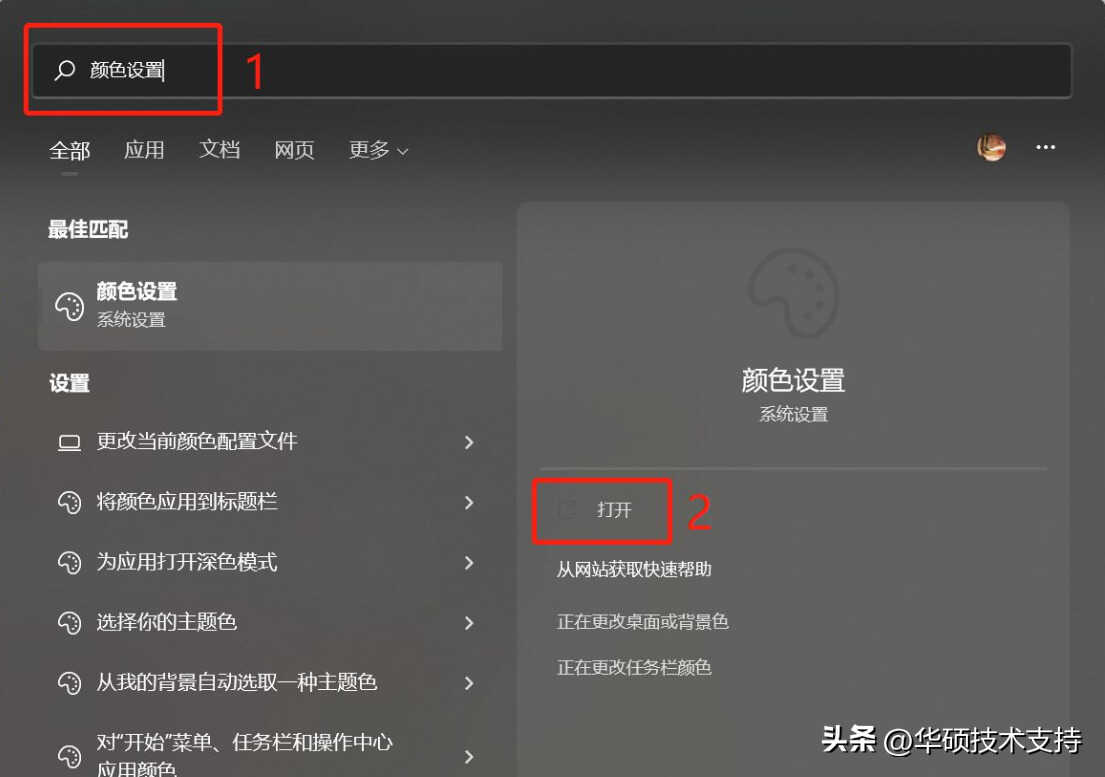 1, 在Windows搜索栏输入[颜色设置]①,然后点选[打开]②。