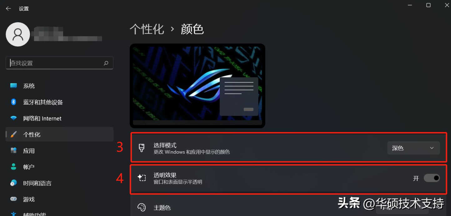 2, 在色彩中,您可以选择您的模式为浅色、深色或自定③。您也可以开启或关闭透明效果④。