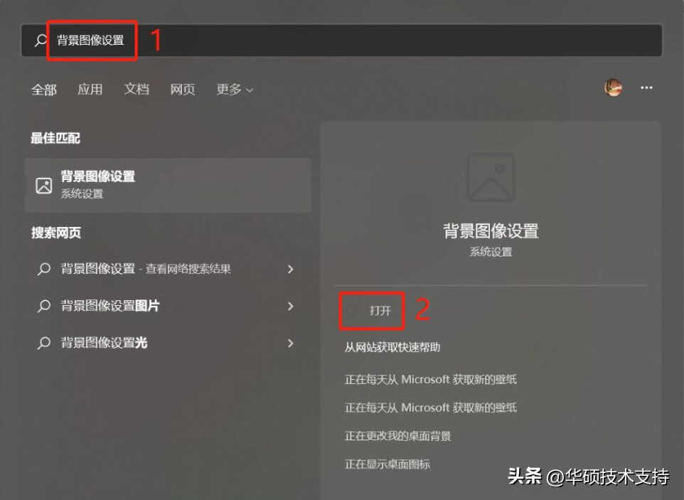 1, 在Windows搜索栏输入[背景图像设置]①,然后点选[打开]②。