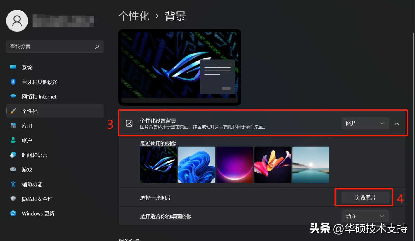 2, 在个人化您的背景中,您可以选择图片、纯色或建立图片的幻灯片秀③。您也可以点选[浏览照片]④,选择其他图片作为背景。