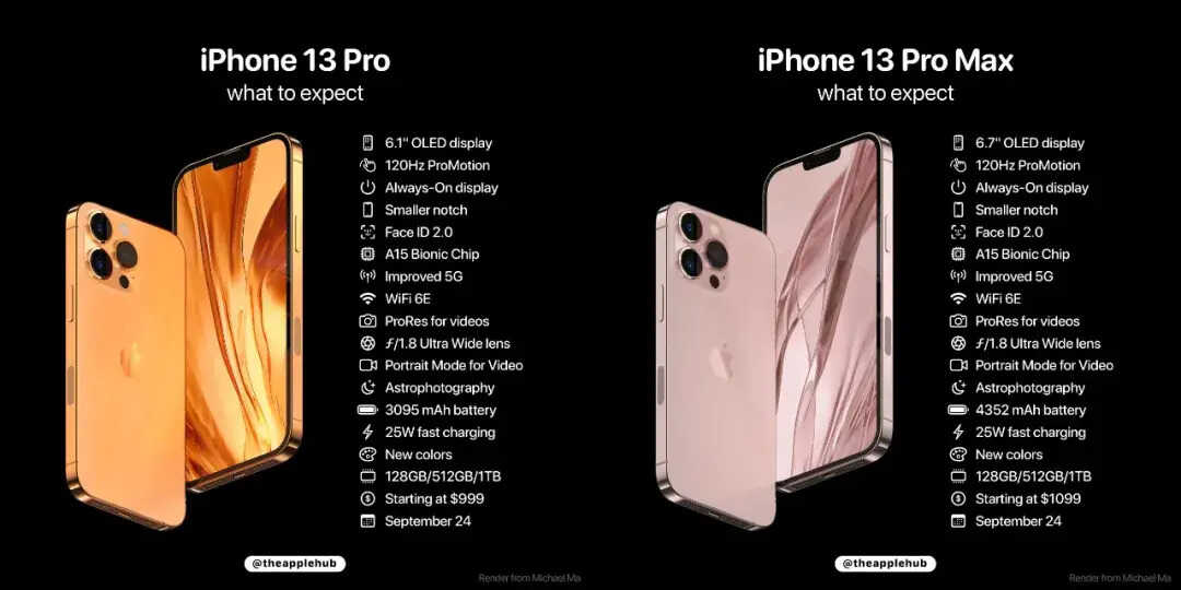 每次推出新 iPhone,苹果都会带来一些新颜色。爆料显示,此次 iPhone 13 系列将带来日落金和玫瑰金。
