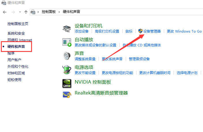 3.选择左侧栏的硬件和声音,然后单击右侧的设备管理器。