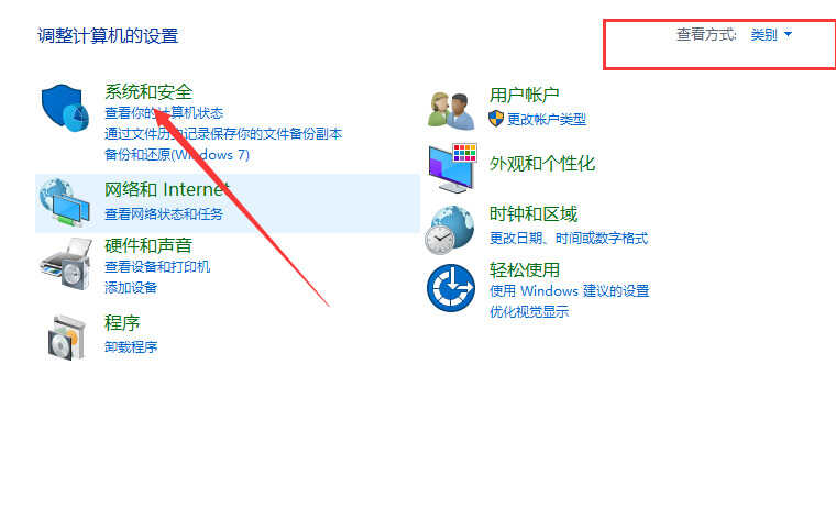 2.打开后,把右上角的查看方式改成类别,选择系统和安全性。