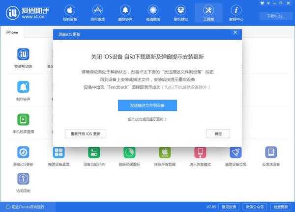 将手机连接到电脑,打开爱思助手 PC 端,在工具箱中点击【屏蔽 iOS 更新】,发送描述文件到设备。