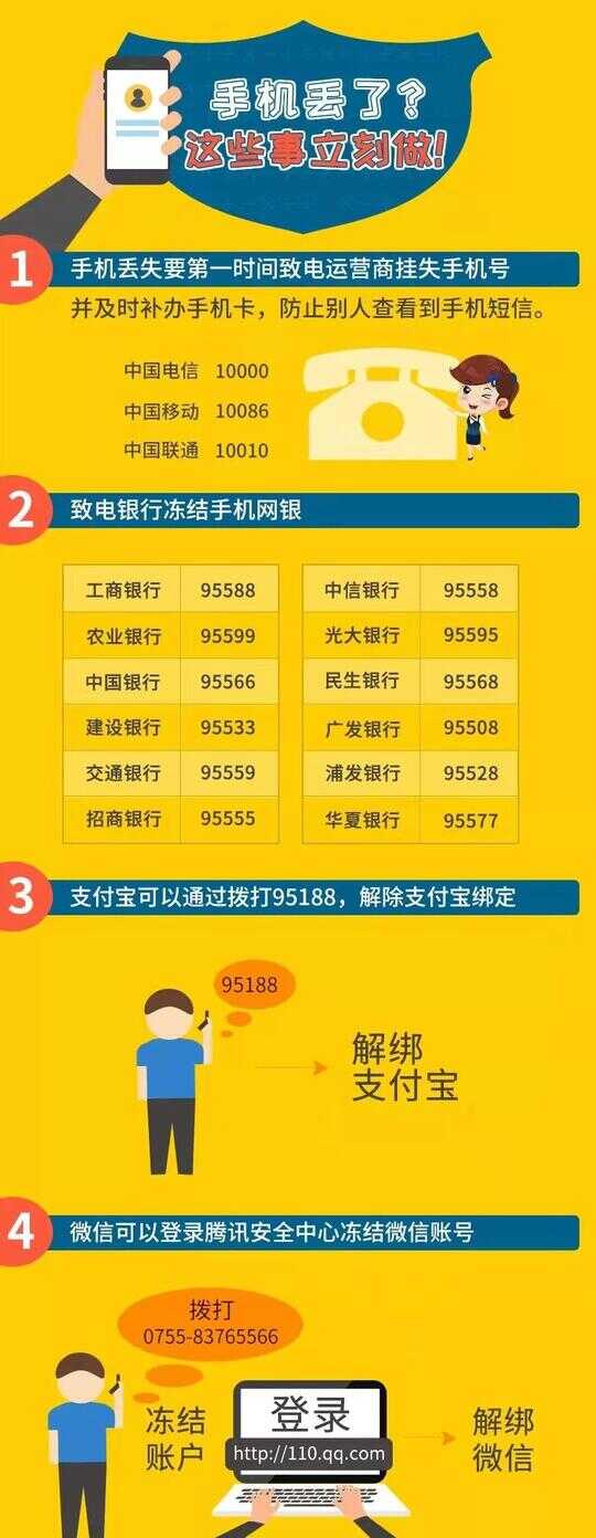 丢手机这件事,相比不少朋友都经历过吧,很多人第一时间都是报警,但其实这是不对的。正确的做法应该是借个电话,第一时间挂失手机号,避免别人获取验证码;随后致电银行客服,挂失手机网银账号;其次打95188,挂失支付宝账号;最后一步则是登陆、冻结微信等社交APP。