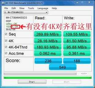 第二种,通过软件AS SSD Benchmark,没有这个软件的可以自己百度下载一个,这个软件经常会用到的。通过这个软件可以看到分区是否4K对齐,如果显示K-OK说明该分区已经对齐了,如果显示K-BAD说明该分区没有对齐,前面的数字不用管它。注意的是通过上面的下拉列表把所以分区都要检测一下,只有所有的分区都是对齐的才是真正的4K对齐。