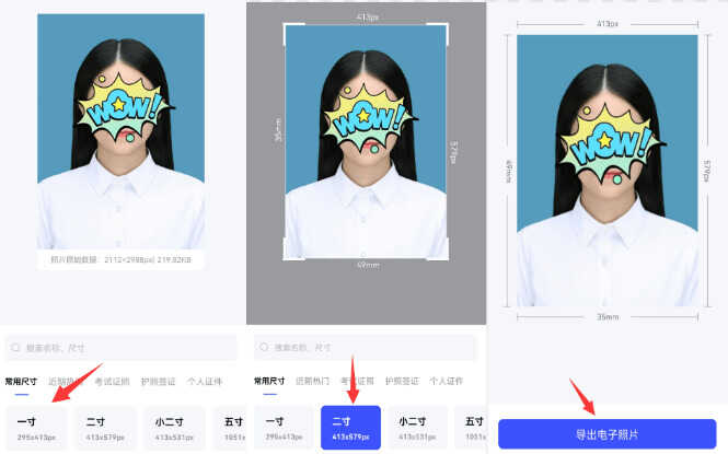选择完成后进入尺寸修改的界面,选择自己需要修改的尺寸进行调整就可以,非常的简单,软件里的尺寸也是很全的,操作方便,完成后点击“导出电子照片”即可
