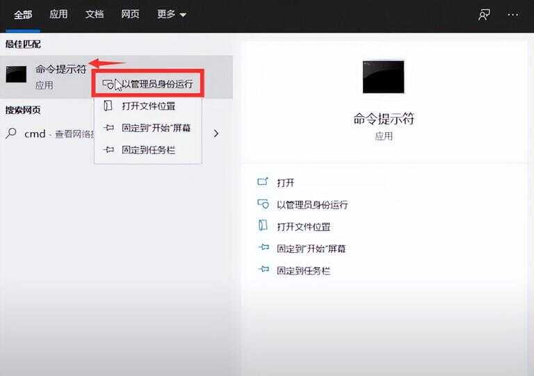 我这边以Windows10操作系统为例,进行一下操作演示。首先,打开电脑左下角的开始菜单,然后在输入框内输入cmd,这时候会出现一个命令提示符的图标,我们将鼠标放到这个图标上,单击鼠标右键,选择以管理员身份运行。