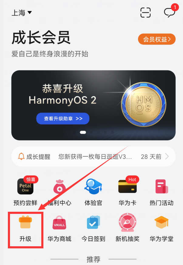 有的手机可能没有“我的华为”app,比方说荣耀手机和比较老的华为手机,这时,我们还可以通过会员中心来进行升级。打开手机的“会员中心”app,进入到会员中心首页(如下图)。