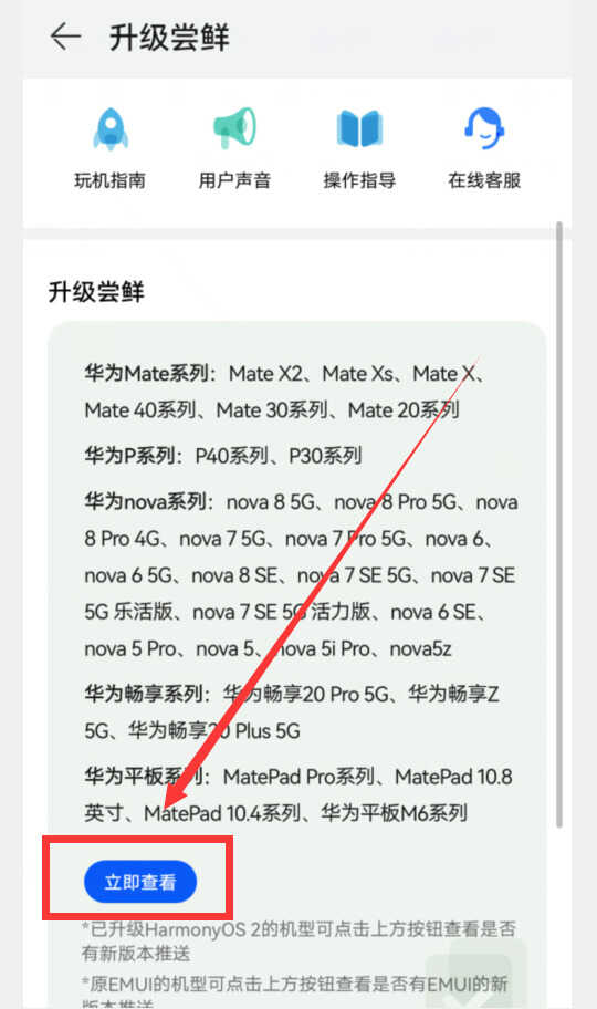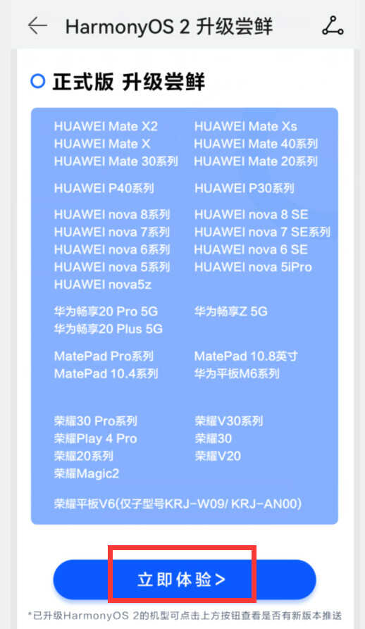 点击“HarmonyOS火热来袭”右侧的“去升级”按钮,就会进入到“升级尝鲜”界面,然后点击“立即体验”就可以检查到鸿蒙系统正式版。