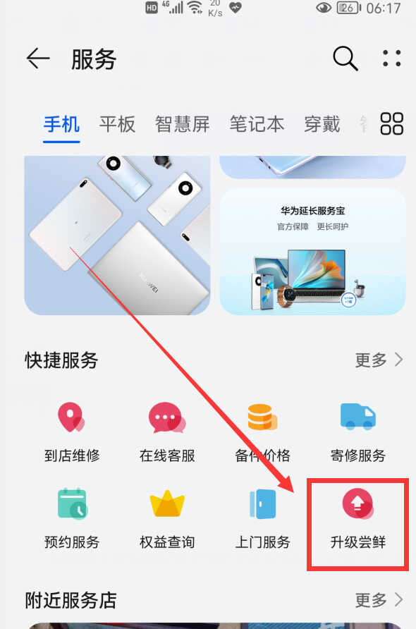 那么华为手机怎样升级到emui基线版本呢?其实方法很简单,打开华为手机的“服务”app(或者打开“我的华为”,再点击“服务”),就会进入到华为手机的服务界面(如下图)。