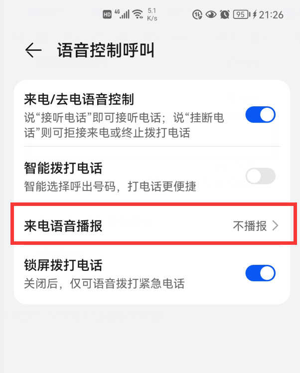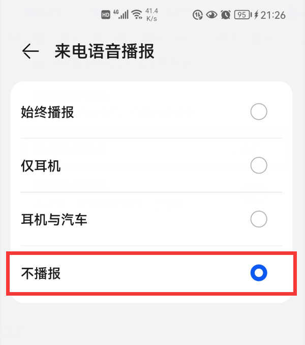 选择“不播报”(如上图),这样就关闭了“来电语音播报”功能,然后,手机接到电话时,就只会播放“视频铃声”了。