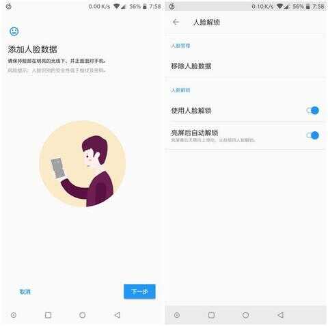 面部解锁是一加5T为解决部分用户不习惯使用后置指纹识别二做出的一项新功能。录入的过程十分的简单。在点亮屏幕的瞬间基本上就能完成解锁,在笔者目前的体验到的面部解锁的手机中速度可以说是最快的。但是比较遗憾的是一加5T上没有使用像iPhone X上的红外镜头、泛光感应原件等,所以一加5T上的面部识别目前只能应用在解锁上,并不能用来支付。