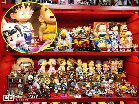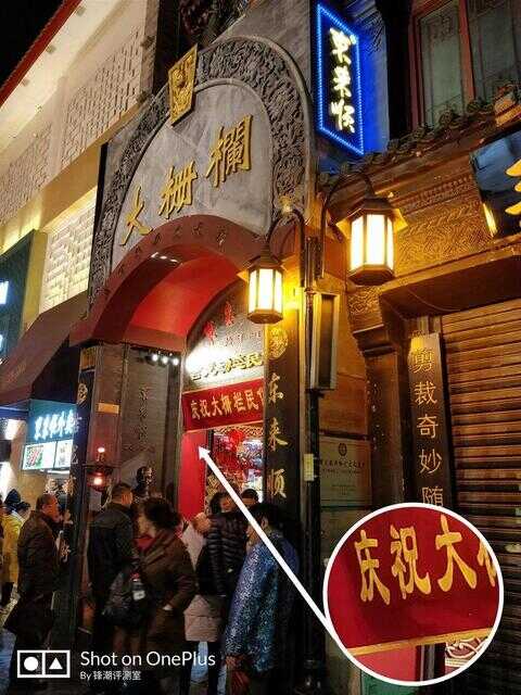 得益于F/1.7的大光圈,一加5T在室内暗光和夜景等方面有更好的表现。具体表现在拍摄暗光场景,细节还原更清晰细腻,即使是放大几倍后,悟空手办后的字体和大珊栏宣传横幅上的字体显示依旧清晰细腻。