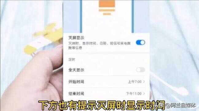 我们把它打开,下方也有提示,熄屏时显示时间、日期、短信和来电提示等信息,我是打开的状态呈蓝色,如果说你的按钮是灰色的,我们把它点一下变成蓝色就打开了这个熄屏显示的功能!在下方还可以设置“定时显示”,还是“全天显示”,大家可以根据自己的情况来选择一下!