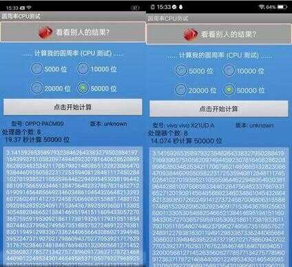 圆周率测试,主要考验CPU的浮点运算性能,50000位的运算结果显示,骁龙660耗时14秒,而联发科P60则耗时19.4秒左右,差距明显。