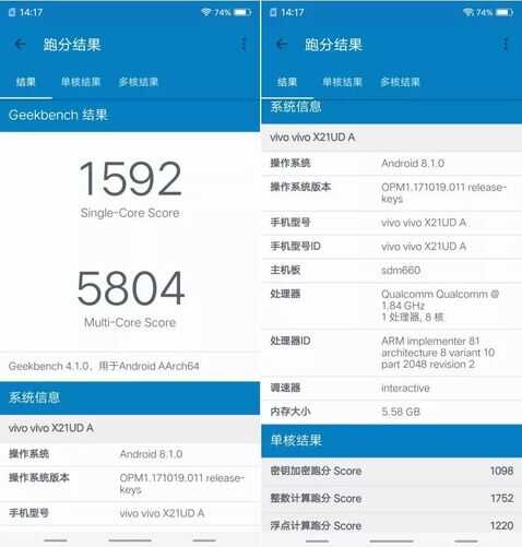 从Geekbench的得分情况来看,P60在单核性能上与骁龙660大致相当。多次测试下来,P60的单核性能得分相较于骁龙660有3%左右的差距。多核性能方面,骁龙660也要略强于P60,但和单核性能得分一样,这种差距依然在3%-4%左右,并不明显。由此我们可以得出P60在CPU性能表现方面和骁龙660大致相当的结论。