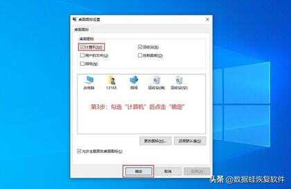 步骤3.在桌面图标中设置中,可以看到你的“计算机(也就是我的电脑、此电脑)”这里没有打开的,我们将它勾选,随后点击“确定”就可以了!