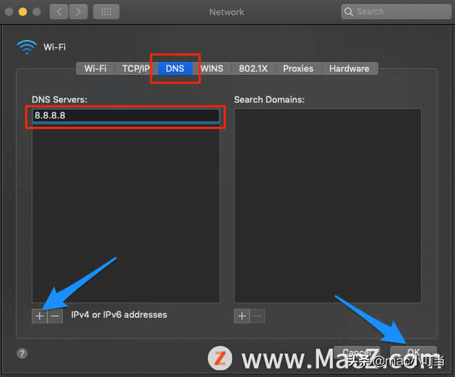 5.单击加号图标,然后将DNS服务器更改为 Google DNS 8.8.8.8 或 Cloudflare DNS 1.1.1.1, 然后单击“确定”。