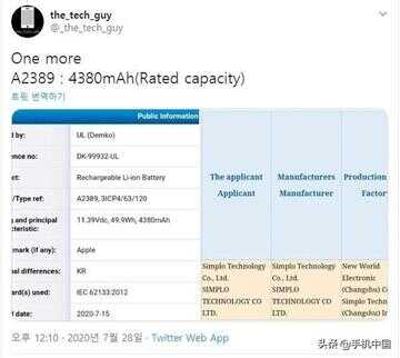 从这张爆料信息表中可以看到,这款苹果手机的型号是A2389,是一款刚通过认证不久的机型。在参数表中,标注有4380mAh字样,显示了该机的电池容量。但是没有显示这款手机的其他硬件配置信息。