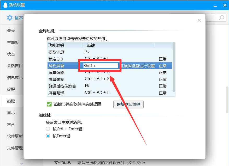 点击“捕捉屏幕”右侧的热键项,就可以修改热键了(如下图),你可以根据自己的习惯,改成自己喜欢的热键。