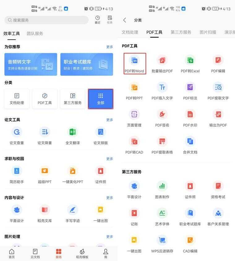 步骤一:打开APP,点击下方工具栏中的“应用”,接着选择“全部”,然后在“PDF工具”中选择“PDF转WORD”工具。
