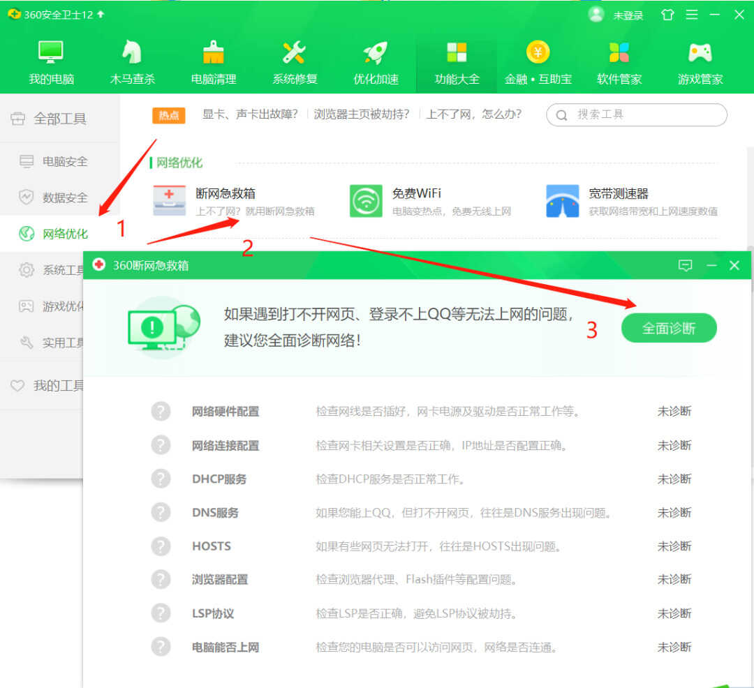 如果LSP修复后还不能上网,再使用一下工具里的断网急救箱。