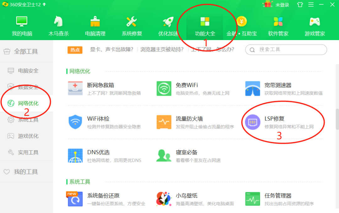 4、如果没有显示XX,可以打开360安全卫士——功能大全——网络优化——找到LSP修复,点修复后看看能否上网。