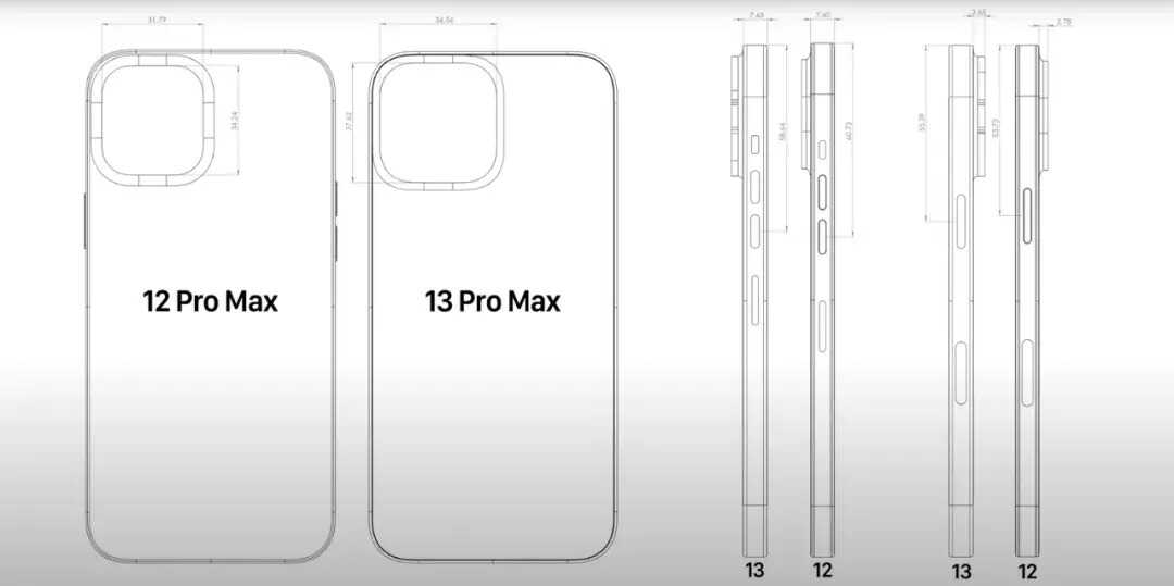 从新款 iPhone 13 Pro Max 的设计图数据来看,新款镜头模组比起前一代更大,从原本宽高 31.79mm × 34.24mm 增加到了 37.62mm × 36.56mm,明显使 iPhone 13 Pro Max 的镜头模组变大不少,同时镜头模组的边缘部分会变得更窄,更加贴近机身的左上角边框。