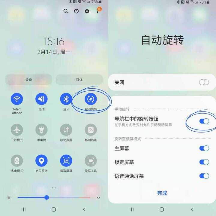 首先下划状态栏,点击“自动旋转”图标下边的小字,关掉自动旋转功能,再开启“导航栏中的旋转按钮”。当我们将手机横过来或竖屏时,屏幕边角就会出现旋转小图标,点击即可手动旋转啦!