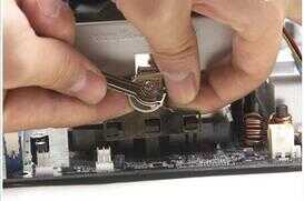 1、拆卸K8 CPU散热器时首先要将金属扣具拉起至另一端。