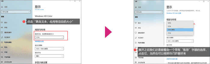 第三步:在“更改文本、应用等项目的大小”这里点击一下,就会将所有大小的选项展开来让你选择,这里我们依然选择带有推荐字眼的那个大小选项,自然也可以根据自己个人喜好进行调整。