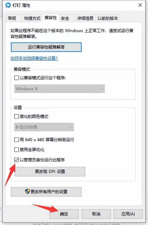 5、因为有时候一些涉及系统设置的应用需要系统管理员权限才能运行,点击”兼容性“,然后勾选”以管理员身份运行“,确认即可。