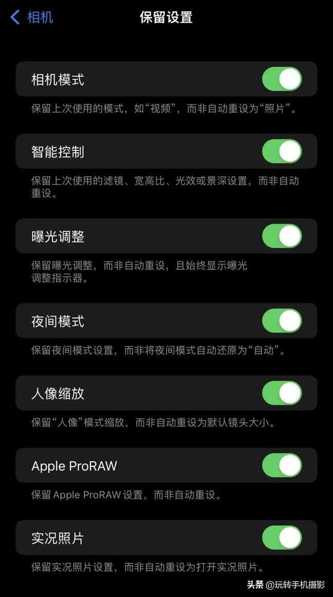 「保留设置」实际上就是保留摄影师的使用习惯,跟前面提到的摄影风格逻辑是一样的。开启这个功能之后,相机会保留你上一次使用的相机模式、滤镜、光效、景深和实况照片等等。