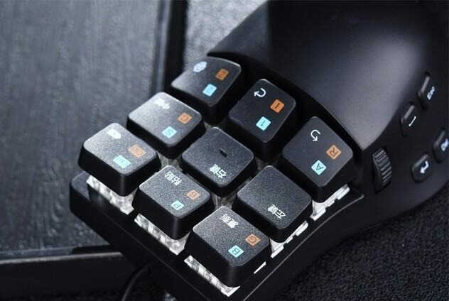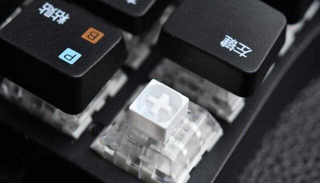鼠标前方的9枚按键均采用了ABS材质,表面字符采用丝印工艺。这9枚按键并没有使用常规的鼠标微动,而是选择了凯华BOX白轴,并且在鼠标主键帽和键轴中间安装了卡销,将轴体本身的3.6mm键程缩短到了2mm,从而加快按键的反应速度。
