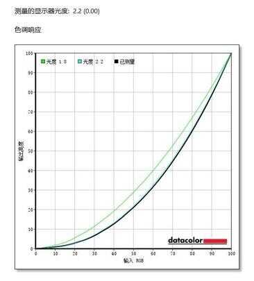色调响应方面,已测量的黑色曲线应该尽量和浅蓝色的“光度2.2”曲线保持一致,可以看到实测的黑色曲线和“光度2.2”基本重合,色调响应表现非常出色。