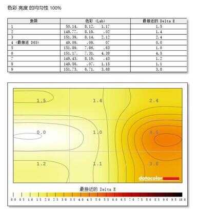 在色彩均匀性的测试中,可以看出HKC VG273QK的第4象限最接近D65的标准,显示器面板的第6象限与标准色温值有一定差距,差距数值为4.5,显示器整体的色彩均匀度表现不错。