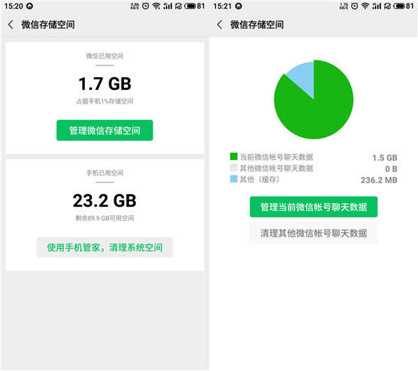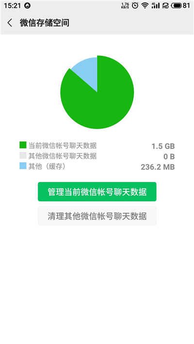 第二种方法是清理微信存储空间,只需要打开微信软件,点击【我】-【设置】-【通用】-【微信存储空间】-【管理微信存储空间】-【管理当前微信账号聊天数据】,然后有选择性地删除一些东西就可以了。
